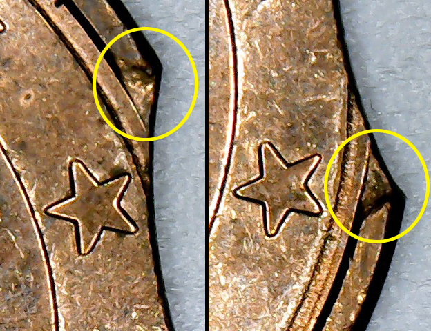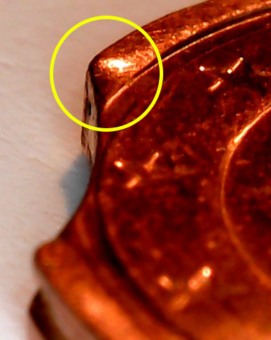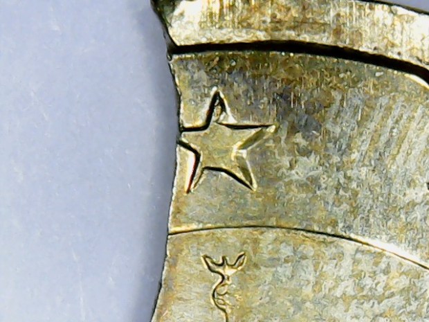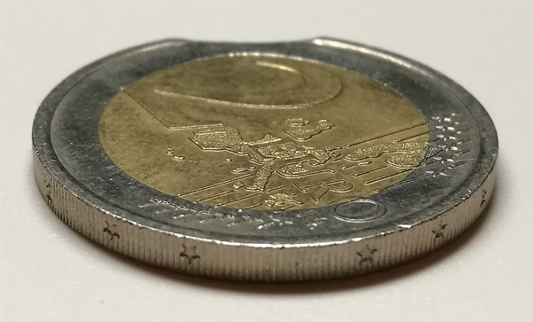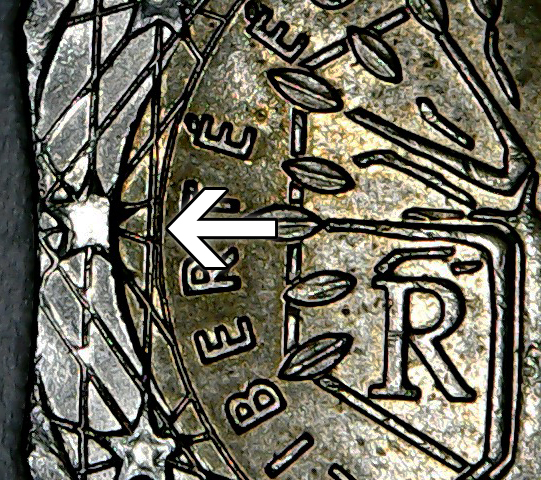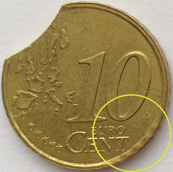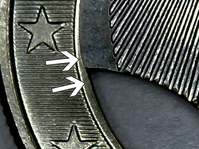 2-1] Pièce clipée sur flan monométallique ou couronne bimétalliqueSur les pièces clipées au niveau d’un listel, on peut observer que celui-ci ne se termine pas de façon nette. Ceci est dû à un étirement du métal du listel lors de la frappe.