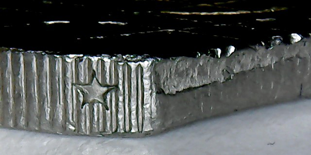 On peut aussi parfois observer (avec des bons yeux ou un microscope) le déchirement du métal lors de la découpe du flan.