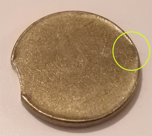 Sur ce flan vierge clipée et cordonné, on voit que ce défaut commence à apparaître avant la frappe.