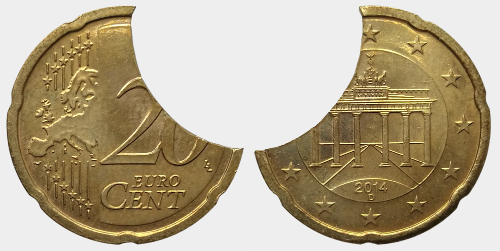 Ce défaut est rare car il combine deux problèmes de presse. Il faut que les poinçons soient décalés comme pour une clipée de type lunule et qu’un flan reste coincé dans la feuille.