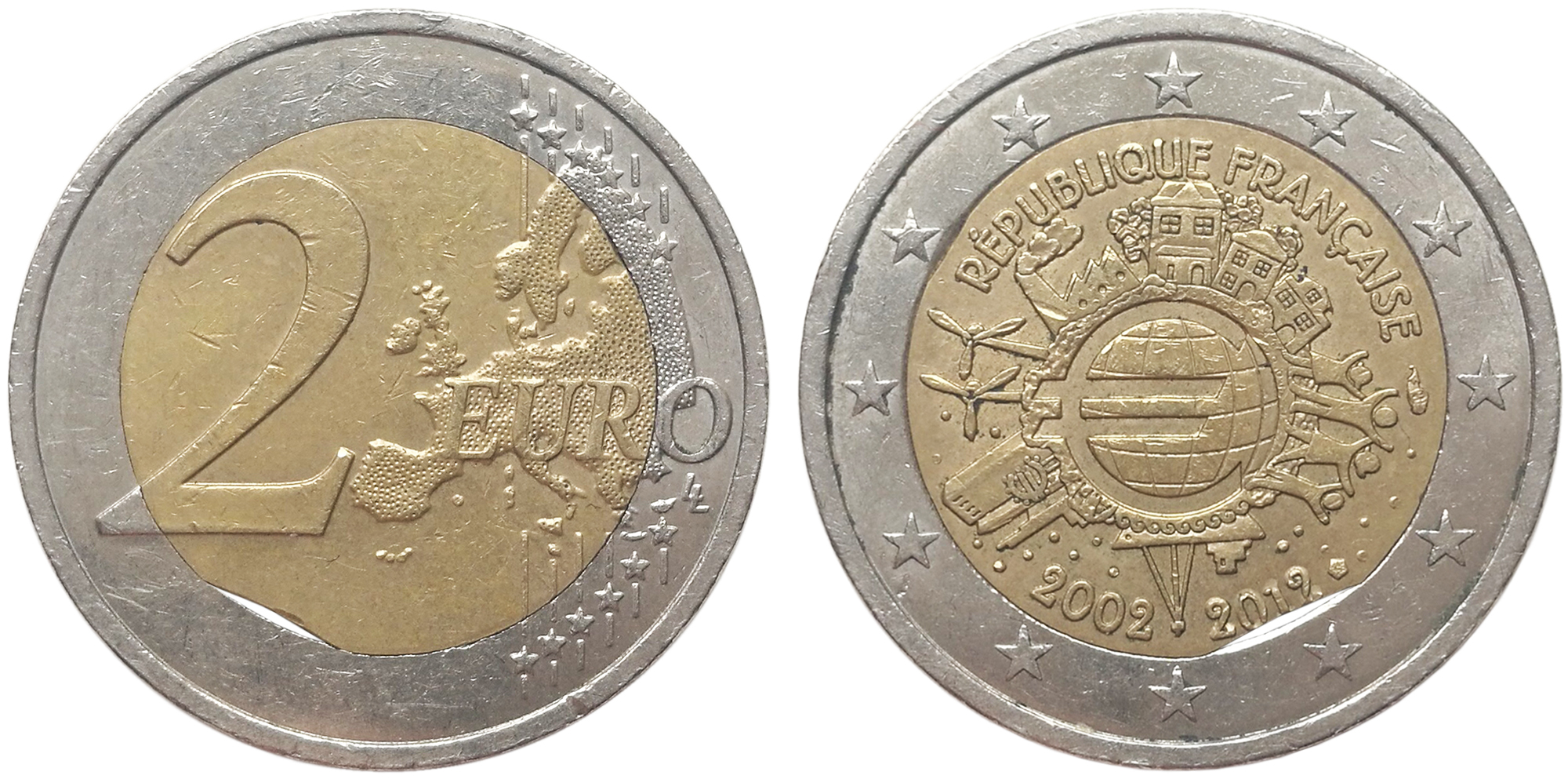 Bimétallique: centre en nickel recouvert de laiton de nickel et anneau en cupronickel (Cœur : trois couches maillechort, 75 % Cu, 20 % Zn, 5 % Ni / nickel / maillechort ; anneau : 75 % Cu, 25 % Ni)